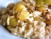 Primeiro tire as peles da uva, colocando cada grao durante um minuto em água quente. Depois tire também as sementes. Inicie a preparar da forma tradicional o risotto: quando o azeite estiver quente coloque a cebola e em seguida o arroz. Despeje o vinho branco e deixe evaporar. Em seguida, adicione a linguiça, anteriormente picada e sem pele e continue a mexer acrescentando algumas conchas de caldo, quando o arroz começar a secar. Coloque agora a uva. Cozinhe por 15 minutos sempre mexendo com uma colher. Quanto o arroz estiver pronto, retire do fogo, adicione o parmesão, uma colher de sopa de manteiga e mexa. Deixe descansar por alguns minutos e sirva.